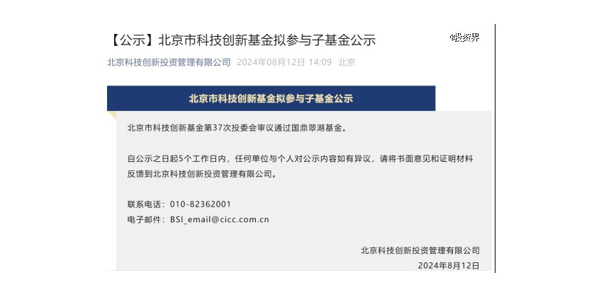 投資界-解碼LP獲悉,近日,北京科技創(chuàng)新投資管理有限公司發(fā)布公告,公示了北京市科技創(chuàng)新基金擬參與子基金,審議通過國鼎翠湖...