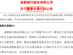【導(dǎo)讀】成都銀行公告王暉辭任董事長,前副行長黃建軍“殺回馬槍”接任8月17日下午,成都銀行(601838)發(fā)布公告稱,公司董事...