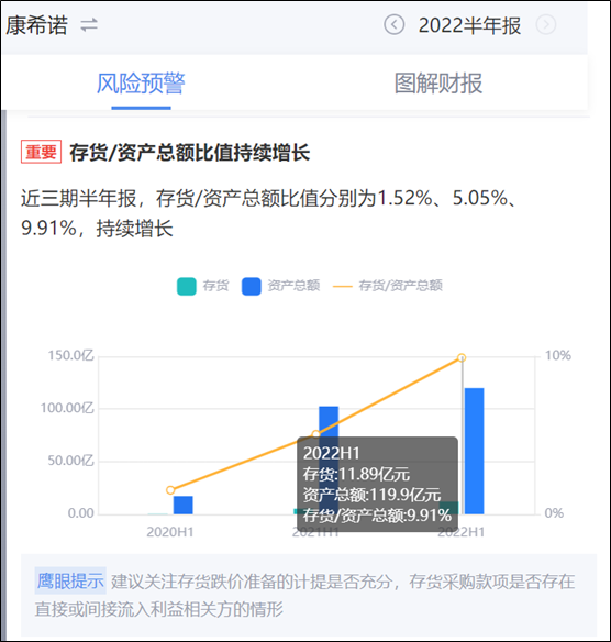 需要指出的是,疫苗由于有時效性,在需求大幅放緩之際,過高的存貨存在較大的減值風(fēng)險。值得主要的是,鷹眼預(yù)警顯示,公司的存貨呈現(xiàn)出持續(xù)走高態(tài)勢。2022年半年報,公司存貨占資產(chǎn)之比為9.91%,金額高達(dá)11.89億元。截止2022年三季報末,公司存貨降至8.8億元。從中或可以看出,康希諾下半年虧損或一大部分由存貨計提減值所致。