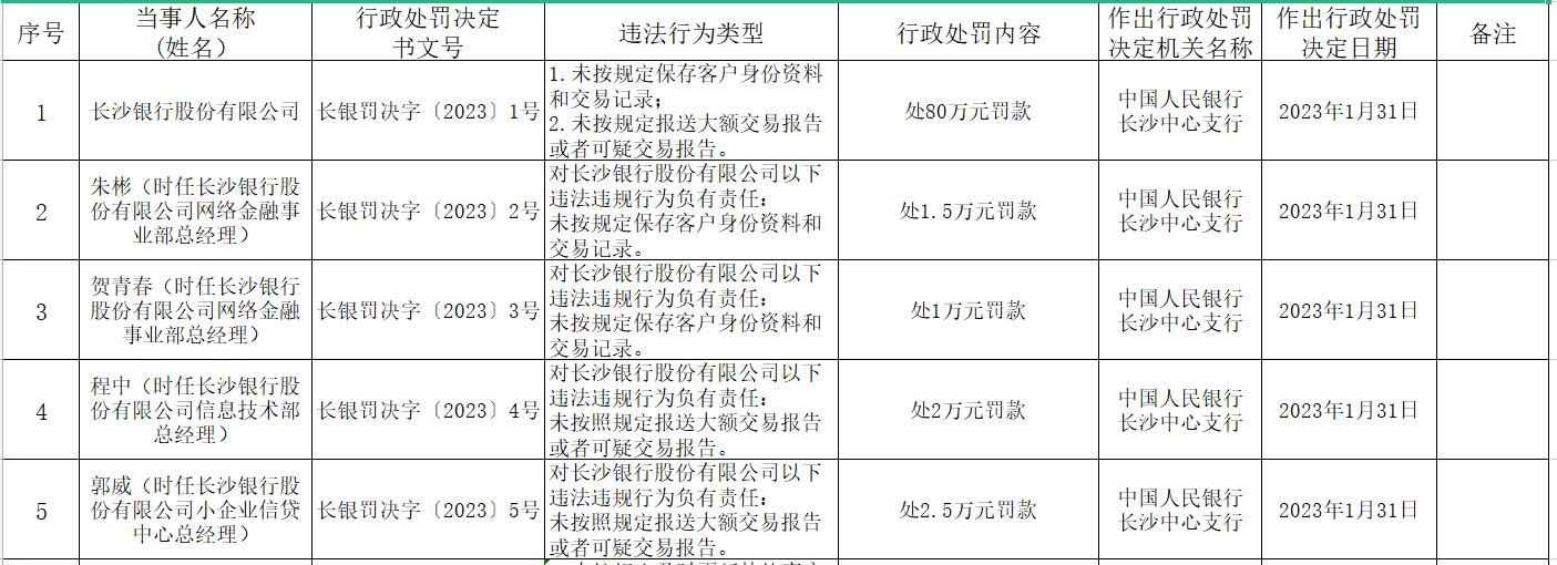 賀青春(時(shí)任長(zhǎng)沙銀行股份有限公司網(wǎng)絡(luò)金融事業(yè)部總經(jīng)理)對(duì)長(zhǎng)沙銀行股份有限公司以下違法違規(guī)行為負(fù)有責(zé)任:未按規(guī)定保存客戶身份資料和交易記錄。中國(guó)人民銀行長(zhǎng)沙中心支行對(duì)賀青春處1萬(wàn)元罰款。