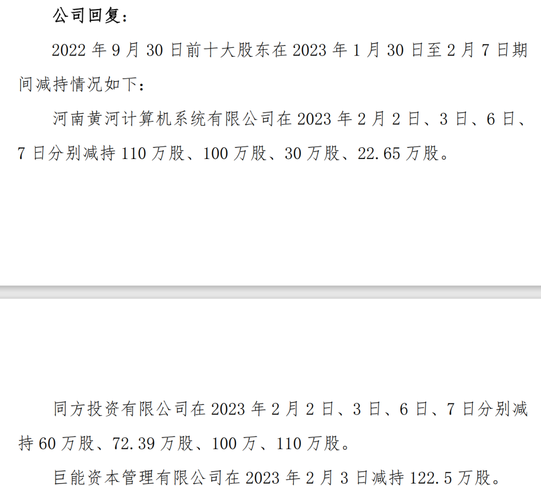河南黃河計算機系統(tǒng)有限公司在2023年2月2日、3日、6日、7日分別減持110萬股、100萬股、30 萬股、22.65萬股,合計減持262.65萬股。2022年三季報顯示,黃河計算機公司持有漢王科技820.07萬股。