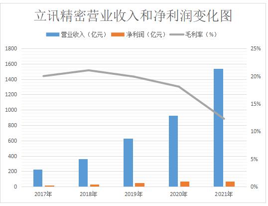 2017-2021年,立訊精密營業(yè)收入228.26億元、358.50億元、625.16億元、925.01億元、1539.46億元;凈利潤分別為16.91億元、27.23億元、47.14億元、72.25億元、70.71億元。