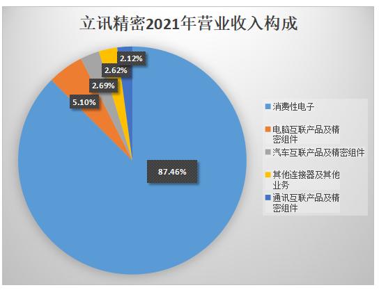 立訊精密以做傳統(tǒng)連接線、連接器起家。公司研發(fā)、制造及銷售的產(chǎn)品主要服務(wù)于消費電子、通信及數(shù)據(jù)中心、汽車電子和醫(yī)療等領(lǐng)域。其中消費電子是立訊精密長期以來營業(yè)收入的主要組成部分,2021年消費性電子收入占其營業(yè)收入的87.46%。