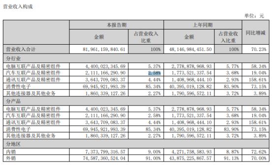 雖然立訊精密已經(jīng)開始在汽車領(lǐng)域發(fā)力,但是從2022年上半年的營業(yè)收入構(gòu)成來看,汽車部分的業(yè)務(wù)收入占比依然較低。2022年上半年,立訊精密汽車部分的業(yè)務(wù)收入仍然只有21.11億元,營業(yè)收入占比只有2.58%。消費電子部分的營業(yè)收入占比依然高達85.34%。