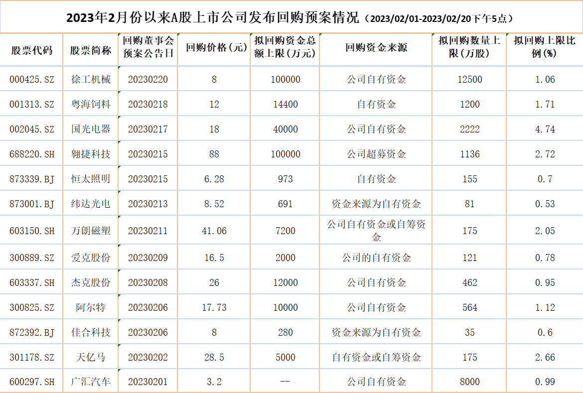 值得一提的是,2023年2月份以來,已有13家上市公司披露了股份回購(gòu)預(yù)案。其中徐工機(jī)械和翱捷科技(688220.SH)擬回購(gòu)資金總額上限均為10億元,是回購(gòu)預(yù)案中擬回購(gòu)資金總額上限最高的。從各上市公司擬回購(gòu)的比例來看,國(guó)光電器(002045)(002045.SZ)的擬回購(gòu)上限比例最高,占其公司總股本的比例為4.74%。此外,從各上市公司的回購(gòu)資金來源看,資金主要來源于公司自有資金或者自籌資金,僅有翱捷科技擬回購(gòu)資金來源于公司超募資金。
