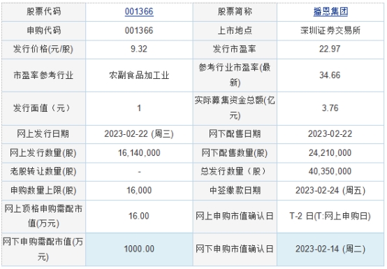 播恩集團(tuán)2023年2月21日披露的首次公開發(fā)行股票發(fā)行公告顯示,按本次發(fā)行價(jià)格9.32元/股計(jì)算,公司預(yù)計(jì)募集資金37,606.20萬元,扣除發(fā)行費(fèi)用5,700.70萬元后,預(yù)計(jì)募集資金凈額為31,905.50萬元。