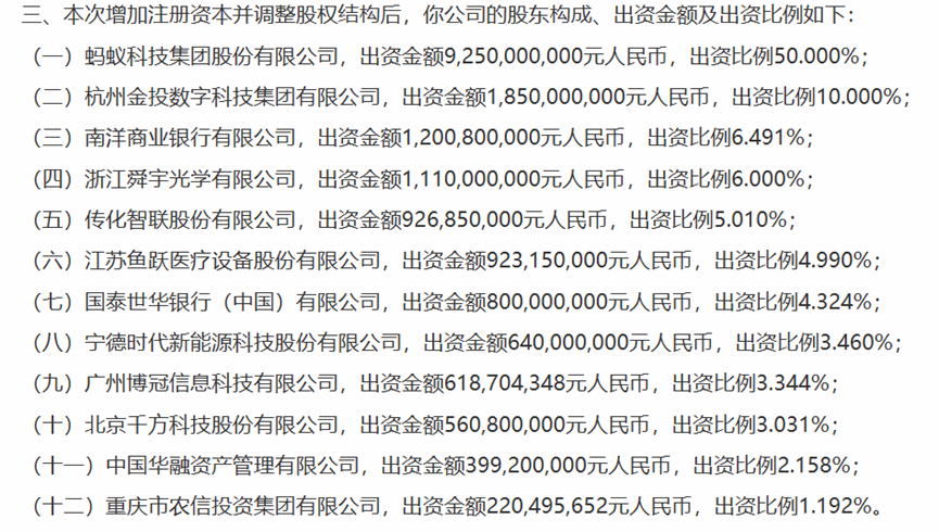 此次增資于2022年12月30日獲重慶銀保監(jiān)局批復(fù),并同意杭金數(shù)科、舜宇光學(xué)、傳化智聯(lián)(002010)投資入股螞蟻消金。