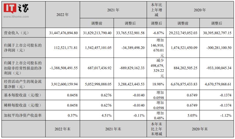 3月15日消息,深天馬昨日披露的2022年年度報告顯示,公司2022年實現(xiàn)營業(yè)收入為314.47億元,同比下降6.87%;歸母凈利潤1.13億元,上年同期調(diào)整后為虧損3438.95萬元,同比增加1.47億元。