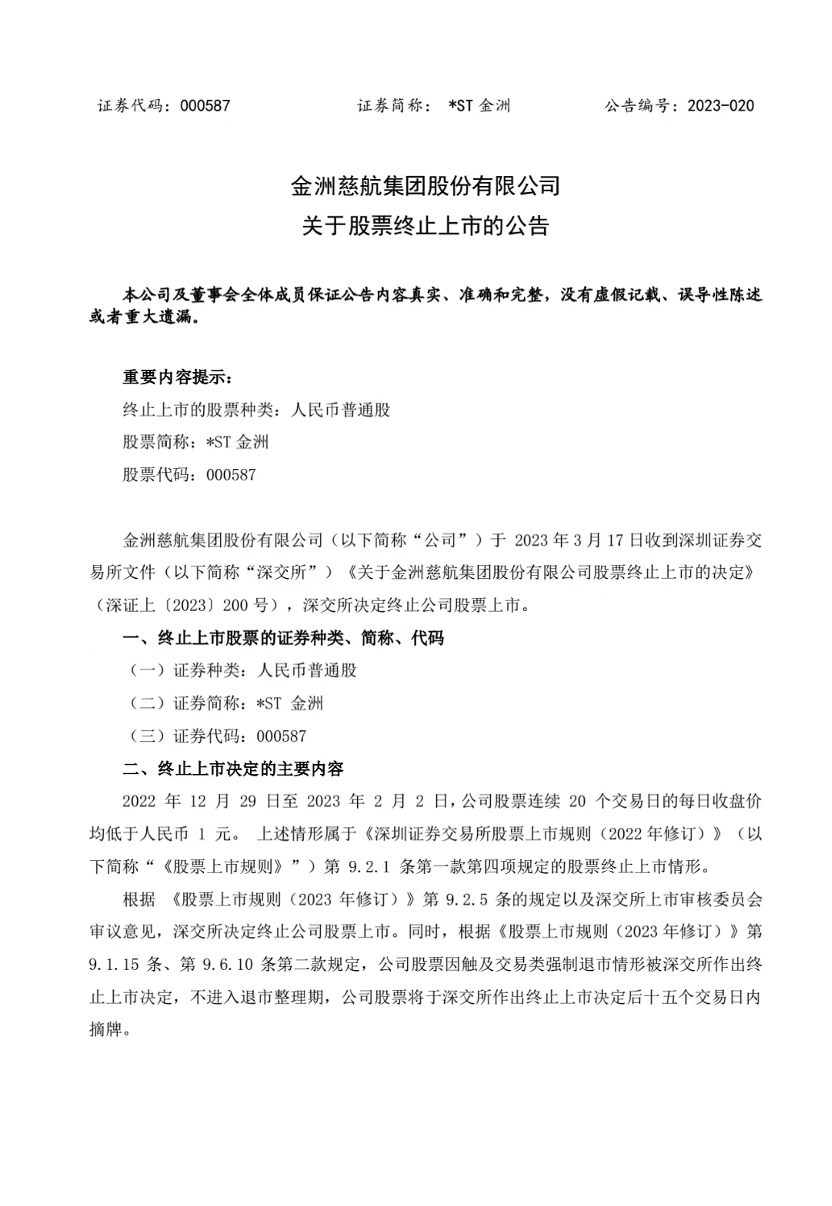 3月17日晚間,*ST金洲(000587)收到深交所《關(guān)于金洲慈航集團(tuán)股份有限公司股票終止上市的決定》,深交所決定終止公司股票上市。