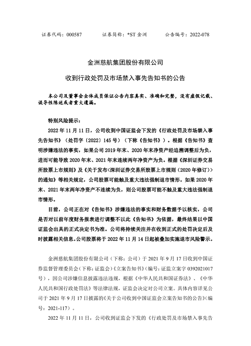 此外,2022年11月14日,*ST金洲還收到證監(jiān)會(huì)《行政處罰及市場(chǎng)禁入事先告知書》。根據(jù)《告知書》查明涉嫌違法的事實(shí),如果公司2019年末、2020年末凈資產(chǎn)經(jīng)追溯調(diào)整后為負(fù),進(jìn)而可能導(dǎo)致2020年末、2021年末連續(xù)兩年凈資產(chǎn)為負(fù)。根據(jù)相關(guān)規(guī)定,*ST金洲股票可能觸及重大違法強(qiáng)制退市情形。