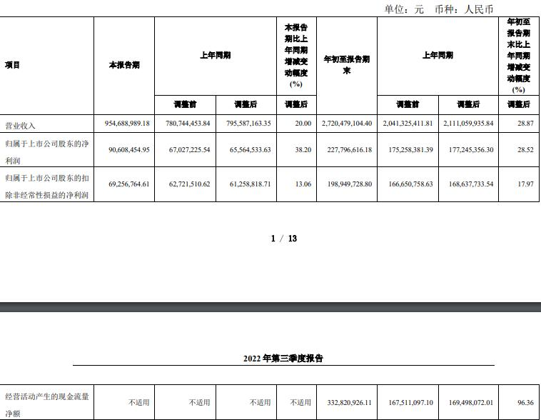 去年前三季度,公司實現(xiàn)營業(yè)收入27.20億元,同比增長28.87%;實現(xiàn)歸屬于上市公司股東的凈利潤2.28億元,同比增長28.52%;實現(xiàn)歸屬于上市公司股東的扣除非經(jīng)常性損益的凈利潤1.99億元,同比增長17.97%;經(jīng)營活動產(chǎn)生的現(xiàn)金流量凈額為3.33億元。