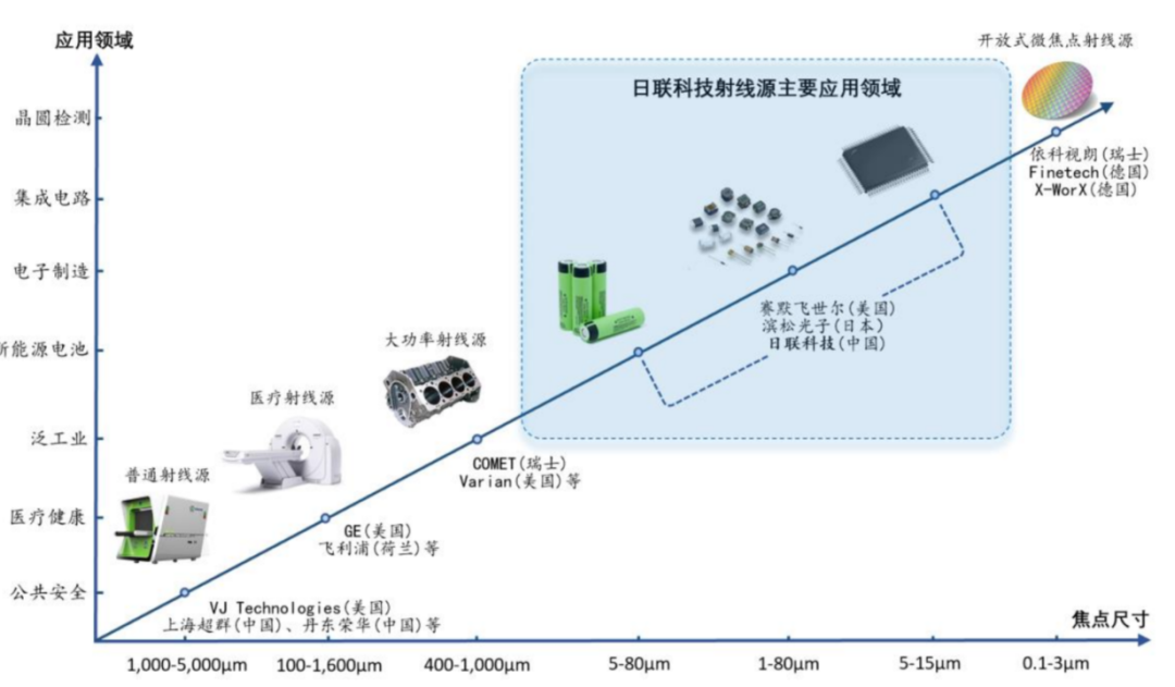 X射線源陰極發(fā)射的電子被聚焦到靶上的一個點,稱之為焦點,焦點的尺寸越小,則檢測精度越高。因X射線能量高、穿透力強等特點廣泛應(yīng)用于醫(yī)療健康和工業(yè)影像檢測等領(lǐng)域。在集成電路、電子制造、新能源電池等精密制造領(lǐng)域,為滿足高精度檢測要求,須配置微米級、納米級焦點尺寸X射線源,即微焦點X射線源。