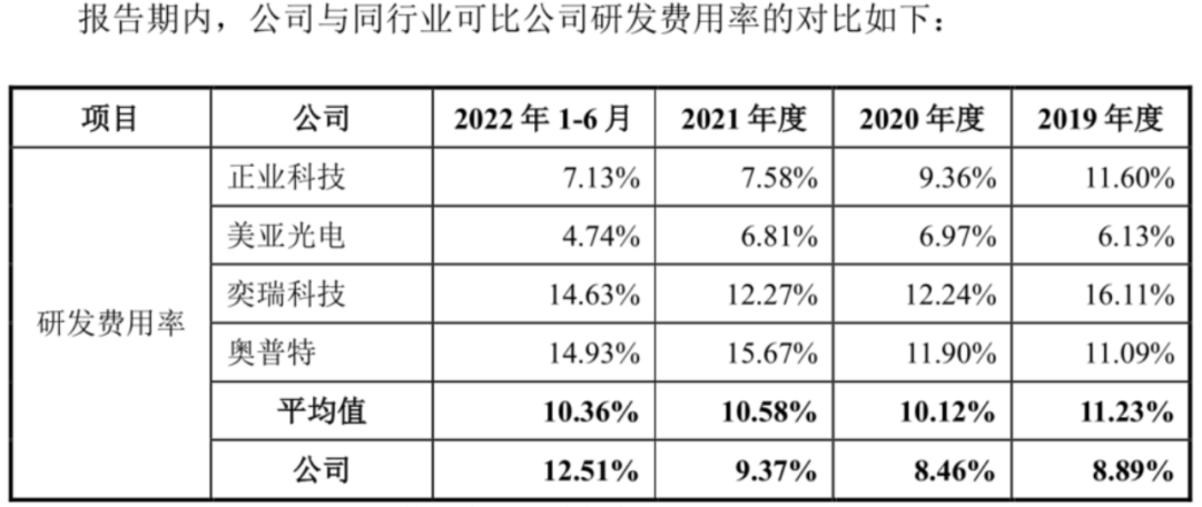然而面對如此局面,公司報告期內(nèi)公司研發(fā)費用率分別為8.89%、8.46%、9.37%和12.51%,同期同行業(yè)可比公司研發(fā)費用率平均值為11.23%、10.12%、10.58%和10.36%。公司不僅業(yè)績規(guī)模低于可比公司,研發(fā)費用率也低于同行業(yè)領(lǐng)先公司,且多數(shù)年份也低于行業(yè)均值水平。