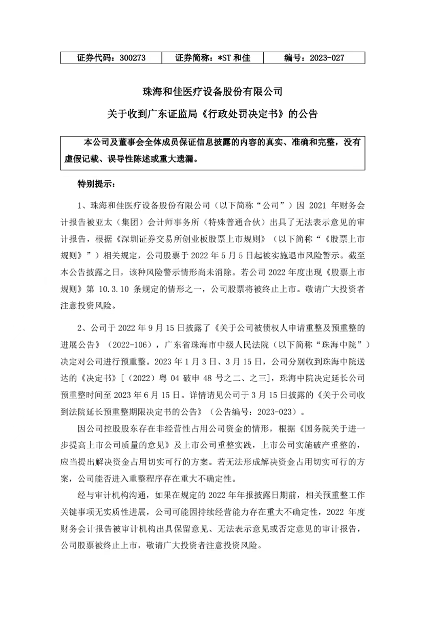 根據(jù)公告,因涉嫌信息披露違法違規(guī),*ST和佳于2022年12月7日收到中國(guó)證監(jiān)會(huì)立案告知書(shū)。3月28日,公司收到廣東證監(jiān)局送達(dá)的《行政處罰決定書(shū)》。
