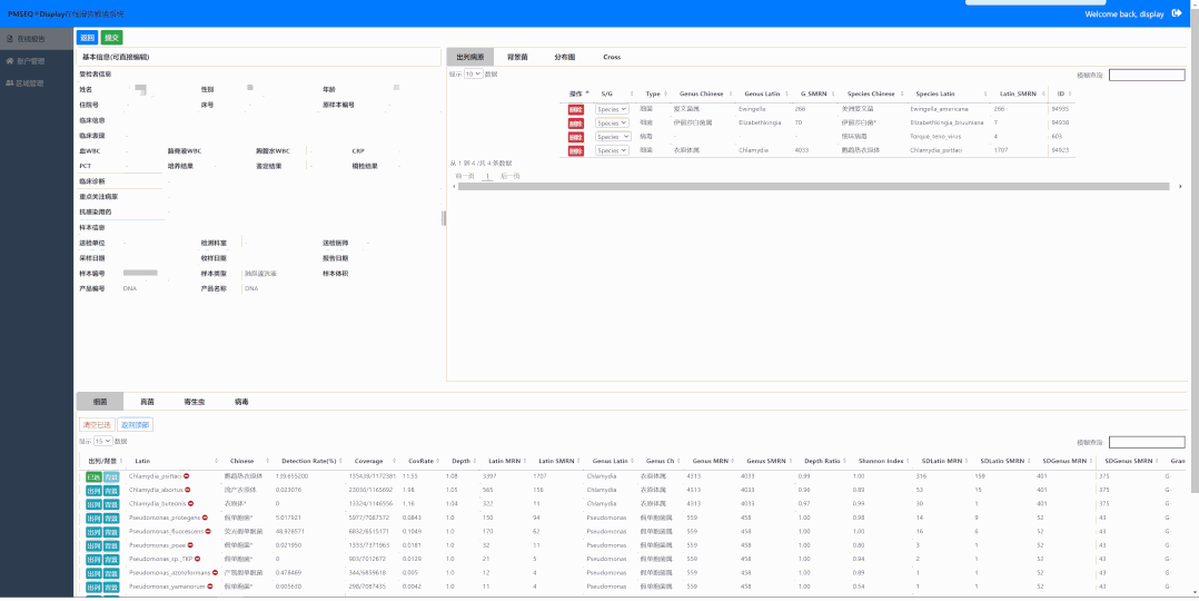 PM Display智能報告系統(tǒng)是配套PMseq 病原微生物高通量測序產品的組學大數據分析系統(tǒng),實現(xiàn)對PMseq 病原檢測后的檢測結果歸集、存儲、統(tǒng)計、分析、數據挖掘。使用可視化操作界面,人工確定檢出病原為最終臨床報告。該系統(tǒng)帶自我學習功能,在使用過程中不斷結合用戶給出的結果優(yōu)化默認推薦病原,并能結合PM Online給出不同病原的檢出分布。