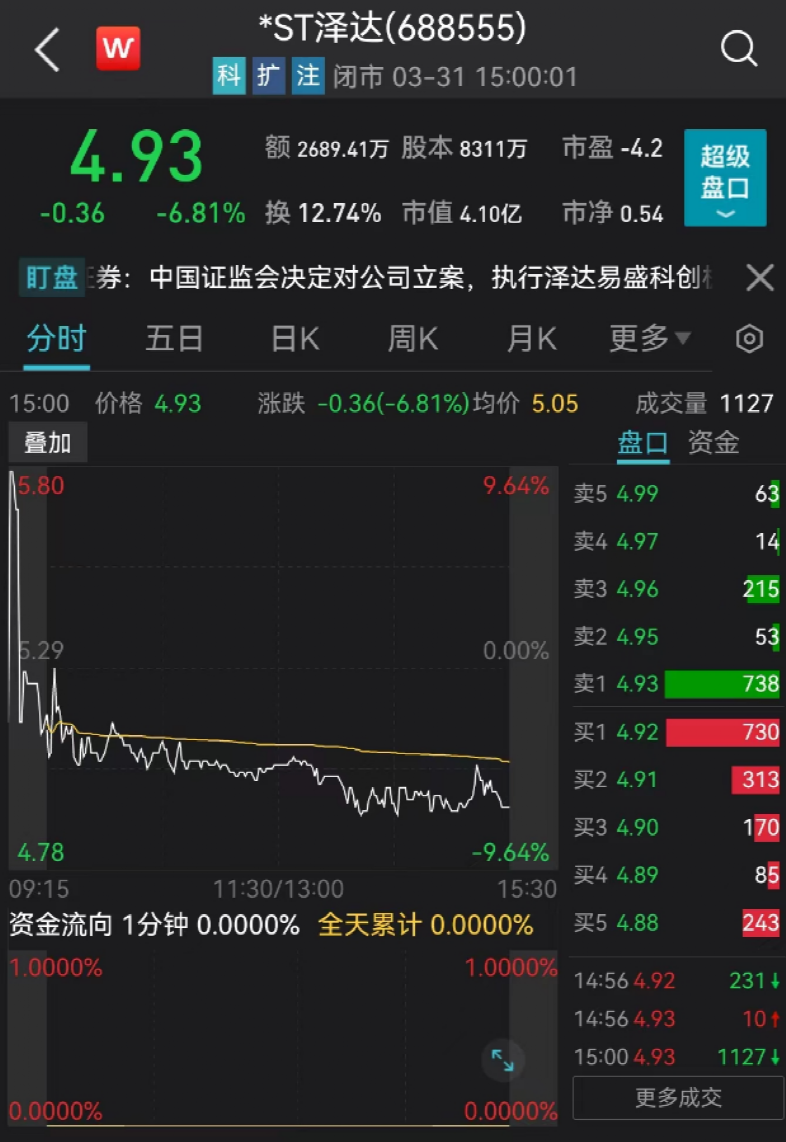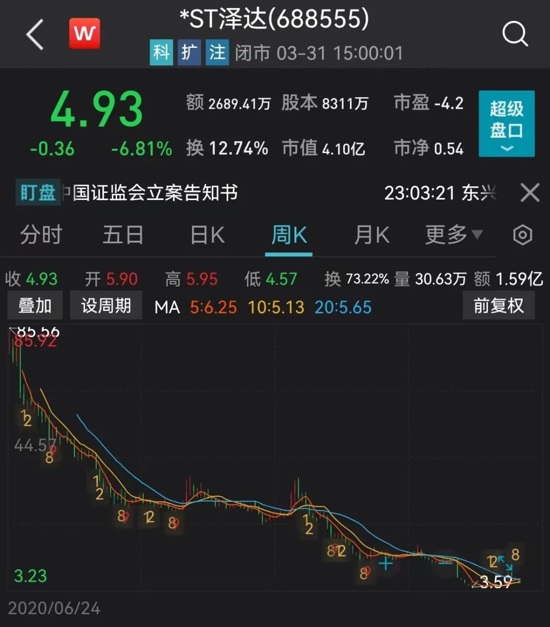 2020年6月,澤達(dá)易盛登陸科創(chuàng)板市場,上市初期股價(jià)曾達(dá)到85.56元/股的高位。此后,澤達(dá)易盛股價(jià)一路下行,在遭遇證監(jiān)會(huì)調(diào)查及下發(fā)行政處罰事先告知書等時(shí)期,更是連拉“20CM”跌停。至今,“披星戴帽”的*ST澤達(dá)總市值僅余4.1億元。
