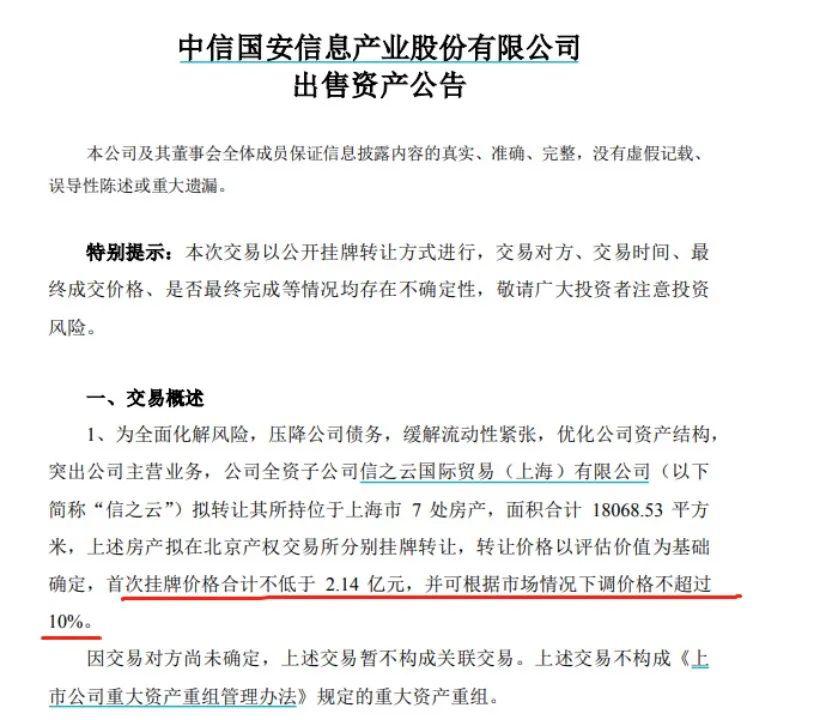 根據(jù)ST國安4月3日發(fā)布的公告,為全面化解風險,壓降公司債務,緩解流動性緊張,優(yōu)化公司資產(chǎn)結構,突出公司主營業(yè)務,公司全資子公司信之云國際貿(mào)易(上海)有限公司(以下簡稱“信之云”)擬轉讓其所持位于上海市7處房產(chǎn),面積合計18068.53平方米,上述房產(chǎn)擬在北京產(chǎn)權交易所分別掛牌轉讓,轉讓價格以評估價值為基礎確定,首次掛牌價格合計不低于2.14億元,并可根據(jù)市場情況下調(diào)價格不超過10%。