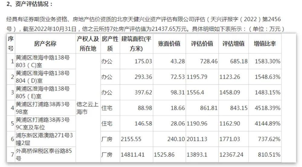 具體來看,這7處房產(chǎn)里有3處為辦公用房,位于黃浦區(qū)淮海中路138號即上海廣場,合計建筑面積約866平方米,合計評估價值達3480.65萬元,增值比率平均值為1538.36%;2處為廠房,分別位為浦東新區(qū)港澳路271號3幢2層、外高橋(600648)保稅區(qū)泰谷路85號,合計建筑面積約1.7萬平方米,合計評估價值約1.59億元,增值比率平均值為774%。