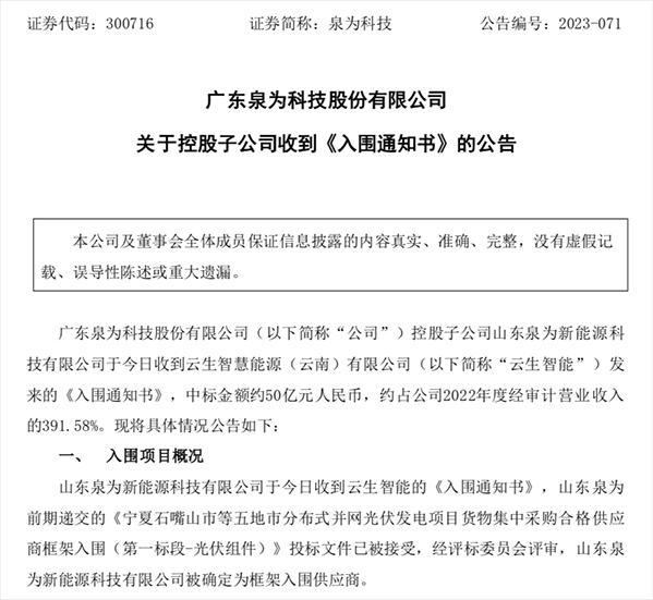 4月11日晚間,泉為科技發(fā)布公告稱,山東泉為收到云生智慧能源(云南)有限公司(簡稱“云生智能”)發(fā)來的《入圍通知書》,山東泉為前期遞交的投標文件已被接受,經(jīng)評標委員會評審,山東泉為被確定為框架入圍供應商。中標金額約50億元,約占公司2022年度經(jīng)審計營業(yè)收入的391.58%。