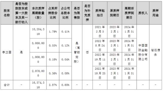 根據(jù)公告,公司接到李衛(wèi)國(guó)函告,獲悉李衛(wèi)國(guó)所持有公司部分被質(zhì)押的股份辦理了展期。本次質(zhì)押展期數(shù)量合計(jì)為16,374,310股,占其所持股份比例為2.87%,占公司總股本比例為0.65%。