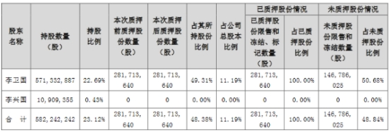李衛(wèi)國(guó)及其一致行動(dòng)人李興國(guó)合計(jì)持有公司股份582,242,242股,占公司總股本的23.12%,完成本次部分股份質(zhì)押展期后,累計(jì)質(zhì)押所持公司股份為281,713,640股,占公司總股本的11.19%,占其所持公司股份的48.38%。