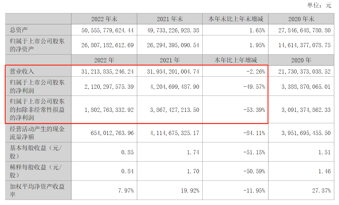 4月12日晚間,公司披露了2022年年度報告。報告期內,公司實現(xiàn)營收312.14億元,同比下降2.26%,主要受下游需求疲軟影響;實現(xiàn)歸屬于上市公司股東的凈利潤21.2億元,同比下降49.57%;歸屬于上市公司股東的扣非凈利潤18.03億元,同比下降53.39%。