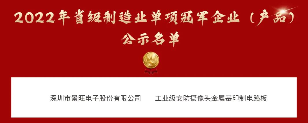 近日,廣東省工業(yè)和信息化廳公示了2022年省級(jí)制造業(yè)單項(xiàng)冠軍企業(yè)(產(chǎn)品)名單,景旺電子(603228)“工業(yè)級(jí)安防攝像頭金屬基印制電路板”榮獲“省級(jí)制造業(yè)單項(xiàng)冠軍產(chǎn)品”稱號(hào)。