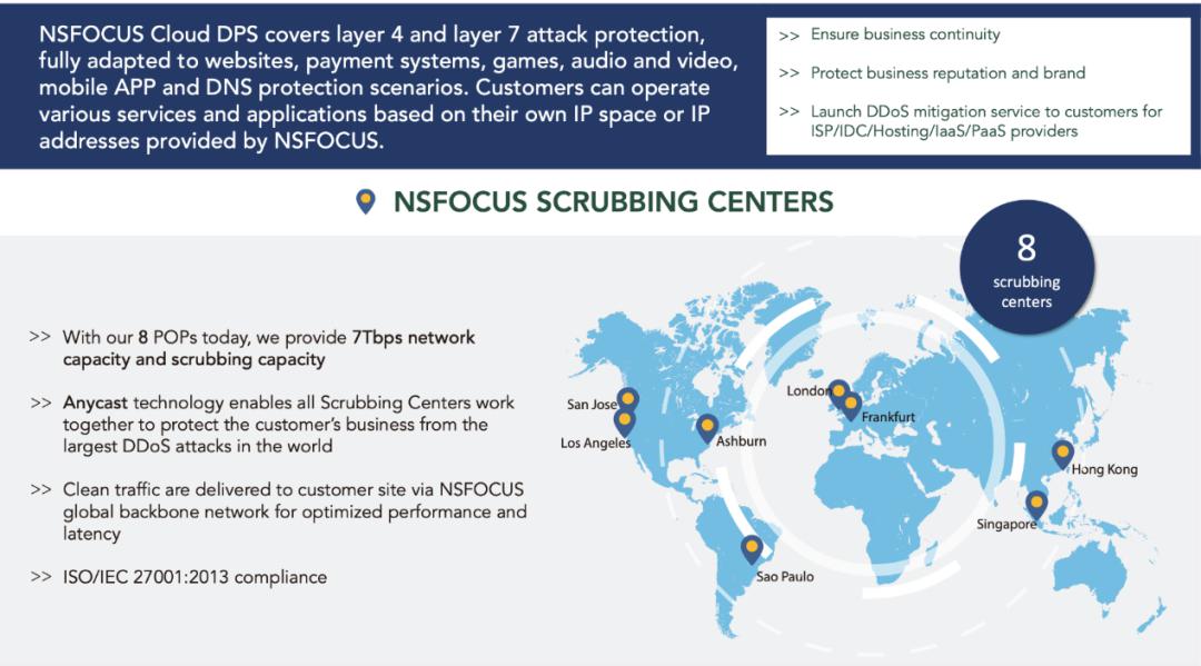 綠盟科技在全球8個數(shù)據(jù)中心搭建了云清洗平臺,通過Anycast技術(shù),綠盟科技國際云清洗服務(wù)可實現(xiàn)全球節(jié)點聯(lián)合近源清洗。2019年新增巴西圣保羅節(jié)點,提供T級云端DDoS防護能力。