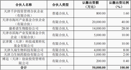 依據(jù)公告,康希諾此次參與設(shè)立的基金名稱為“元希海河(天津)生物醫(yī)藥產(chǎn)業(yè)基金合伙企業(yè)(有限合伙)”(簡稱“元希海河基金”),成立于2023年4月20日,基金規(guī)模5億元,共有8名投資人(如下圖)。