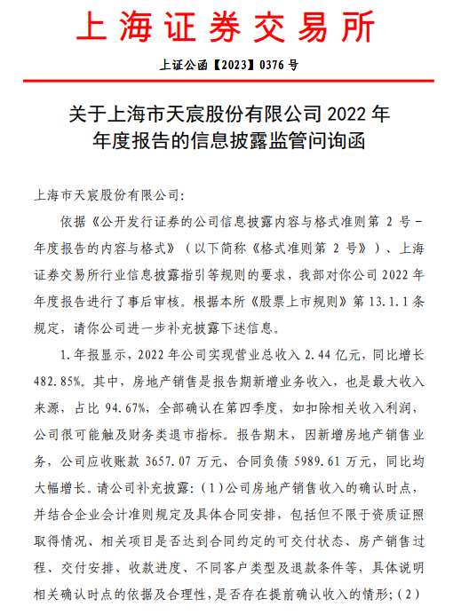在年報披露后,天宸股份收到了上交所下發(fā)的問詢函。上交所要求其補充說明公司房地產(chǎn)銷售收入的確認(rèn)時點,并結(jié)合企業(yè)會計準(zhǔn)則規(guī)定及具體合同安排,具體說明相關(guān)確認(rèn)時點的依據(jù)及合理性,是否存在提前確認(rèn)收入的情形;主要房地產(chǎn)客戶資金來源,核實相關(guān)資金軌跡是否涉及公司及潛在關(guān)聯(lián)方,是否存在關(guān)聯(lián)交易非關(guān)聯(lián)化、收入確認(rèn)不具備商業(yè)實質(zhì)的情形;應(yīng)收賬款前五名客戶情況、是否涉及關(guān)聯(lián)方或利益相關(guān)方,并結(jié)合具體業(yè)務(wù)模式,包括但不限于建造、銷售、收款流程等,說明相關(guān)應(yīng)收賬款及合同負(fù)債的性質(zhì),是否符合一般房地產(chǎn)銷售慣例;公司房地產(chǎn)銷售業(yè)務(wù)是否屬于未形成或難以形成穩(wěn)定業(yè)務(wù)模式的業(yè)務(wù)、與主營業(yè)務(wù)無關(guān)或不具備商業(yè)實質(zhì)業(yè)務(wù),是否存在應(yīng)扣除收入的情況。
