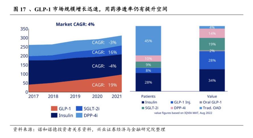 據(jù)悉,GLP-1類(lèi)產(chǎn)品正在快速增長(zhǎng),市占率有望持續(xù)提升。據(jù)《2022年藥品市場(chǎng)生命周期研究之GLP-1RA篇》報(bào)告預(yù)測(cè),2022年到2030年,中國(guó)GLP-1RA市場(chǎng)規(guī)模將從56億元增長(zhǎng)至158億,復(fù)合增速14%。廣發(fā)證券研報(bào)顯示,2022年,GLP-1市場(chǎng)規(guī)模超過(guò)200億美元,超過(guò)胰島素,并在降糖與減重兩大領(lǐng)域不斷挖潛。興業(yè)證券認(rèn)為,隨著越來(lái)越多的GLP-1用藥獲批,GLP-1整體滲透率有望持續(xù)提升。