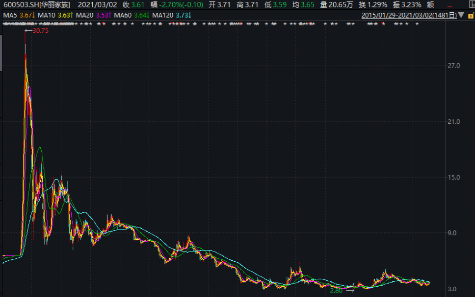 華麗家族在2015年的股價(jià)最高達(dá)30.75元,隨后不斷下跌,已經(jīng)淪為2元股多年,澤熙系持股市值已跌至2億元。