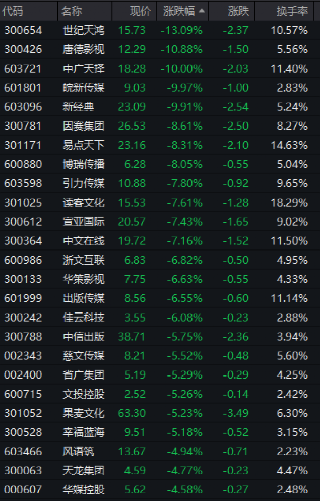 傳媒板塊快速跳水,世紀(jì)天鴻(300654)跌超13%,皖新傳媒(601801)、中廣天擇(603721)等跌停,新經(jīng)典(603096)、易點(diǎn)天下(301171)、引力傳媒(603598)均大跌超6%。