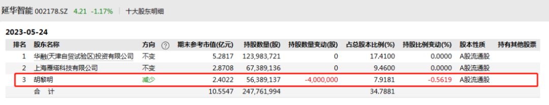 數(shù)據(jù)顯示,截至5月24日,該公司第一大股東為華融(天津自貿(mào)試驗(yàn)區(qū))投資有限公司,持股比例17.41%;胡黎明持股數(shù)量減少了400萬股,不過仍以7.92%的持股比例位列公司第三大股東。