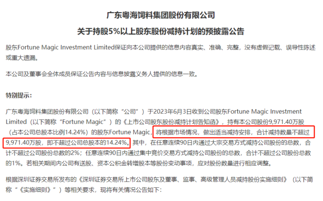 6月4日晚間,A股公司粵海飼料(001313)公告,持股14.24%的股東Fortune Magic Investment Limited,擬減持公司不超過9971.4萬股,即不超過公司總股本的14.24%,也就是準備將持倉的所有股票進行減持了。