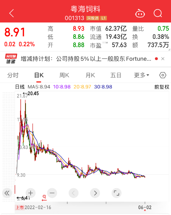 Fortune Magic Investment Limited持有的股份今年2月剛剛解禁,按照粵海飼料最新收盤價8.91元計算,擬減倉市值8.88億元,接近9億元。
