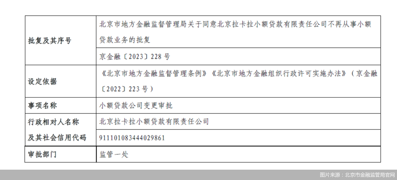 6月5日,記者注意到,北京市地方金融監(jiān)督管理局(以下簡稱“北京市金融監(jiān)管局”)日前發(fā)布小額貸款公司變更審批事項公告,同意北京拉卡拉小額貸款有限責任公司(以下簡稱“北京拉卡拉小貸”)不再從事小額貸款業(yè)務。更早一點,拉卡拉退出中郵消費金融的股東行列,另一張網(wǎng)絡小貸牌照注冊資本也降至2億元。