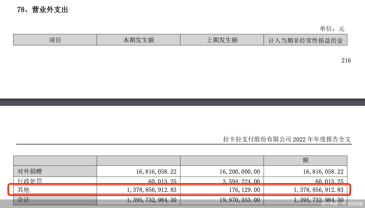 2022年中,第三方支付機構(gòu)因“跳碼”遭處罰的消息傳言四起。2023年4月18日,拉卡拉一紙重大事項的提示性公告承認“跳碼”,并提出將退還涉及資金。在2022年財報中,受到“待處理資金影響”,拉卡拉營業(yè)外支出共計13.96億元,其中包括“其他”13.78億元,這也意味著拉卡拉因為“跳碼”需退還的金額為13.78億元。