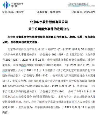值得一提的是,早在2021年3月22日,華宇軟件收到北京市監(jiān)察委員會(huì)通知,對(duì)邵學(xué)涉嫌行賄的違法問(wèn)題立案調(diào)查。