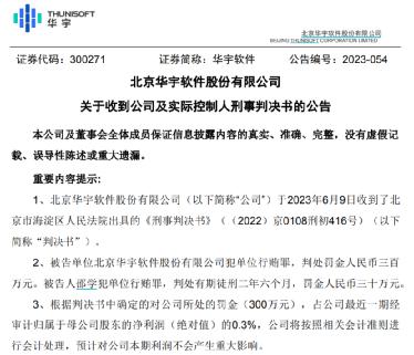 對(duì)于上述判決,華宇軟件表示,300萬(wàn)元罰金占公司最近一期經(jīng)審計(jì)歸屬于母公司股東的凈利潤(rùn)(絕對(duì)值)的0.3%,公司將按照相關(guān)會(huì)計(jì)準(zhǔn)則進(jìn)行會(huì)計(jì)處理,預(yù)計(jì)對(duì)公司本期利潤(rùn)不會(huì)產(chǎn)生重大影響。