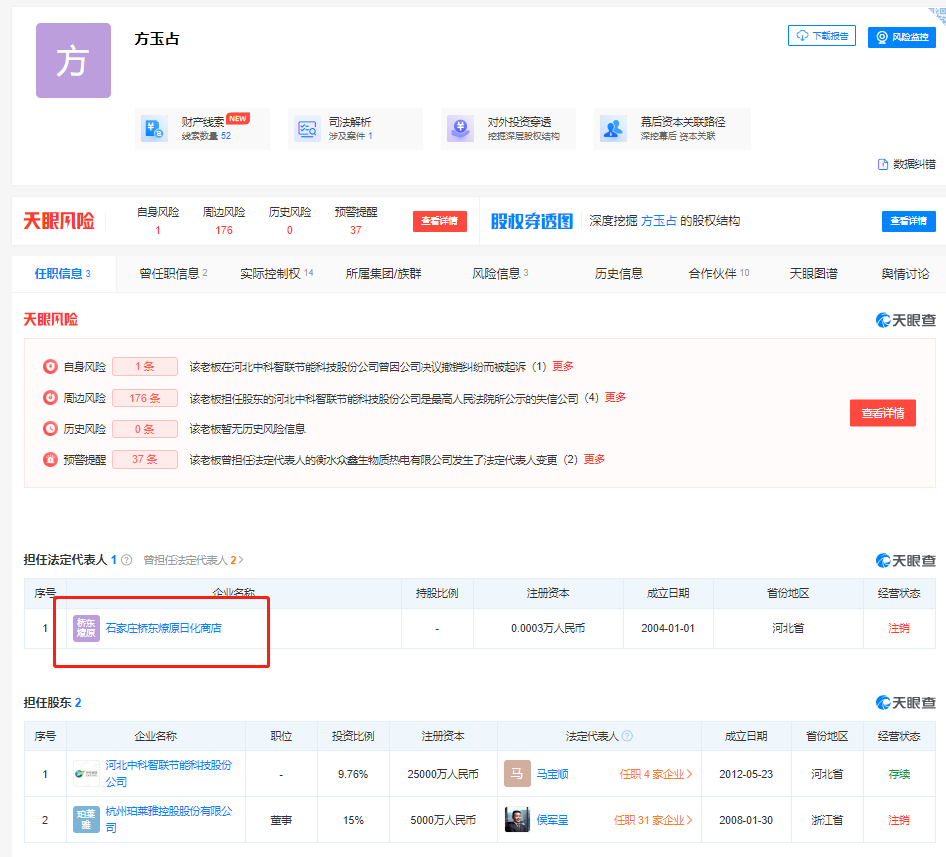 另一位在杭州珀萊雅控股股份有限公司擔(dān)任股東、董事的名叫方玉占的人士曾擔(dān)任石家莊橋東燎原日化商店法人。