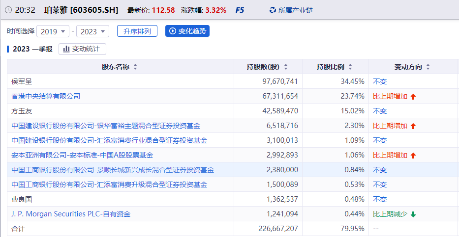 具體來看,方玉友此次被司法凍結(jié)的股數(shù)近1704.13萬股,占方玉友所持有珀萊雅股份數(shù)的28.5806%,占目前珀萊雅總股本的4.2933%;凍結(jié)起始日為2023年5月26日,凍結(jié)申請人為溫州市中級人民法院。按珀萊雅目前最新股價(jià)112.58元/股計(jì)算,被凍結(jié)股份市場價(jià)值或達(dá)19.18億元。