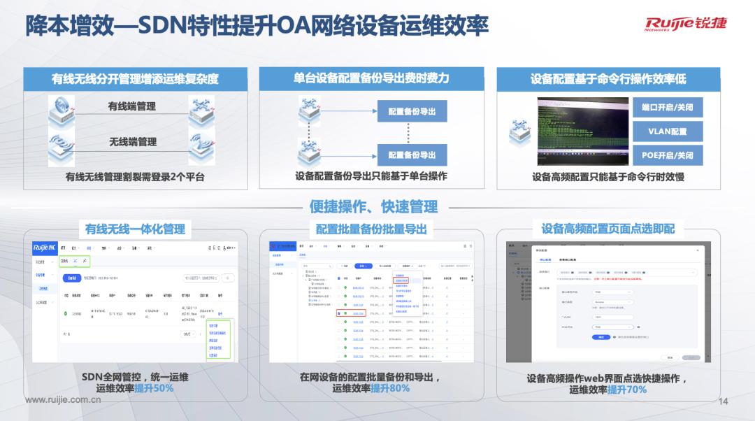 銳捷網(wǎng)絡(luò)SDN解決方案采用了開放標(biāo)準(zhǔn)協(xié)議,可以更簡單地實現(xiàn)網(wǎng)絡(luò)快速部署與應(yīng)用交付。由于車站比較分散,設(shè)備數(shù)量眾多,日常的運維工作壓力巨大,銳捷的SDN控制器可以有線無線統(tǒng)一管理,設(shè)備配置批量備份與導(dǎo)出,高頻操作不用使用命令行配置,按鈕級操作即可,大大提升了運維效率。