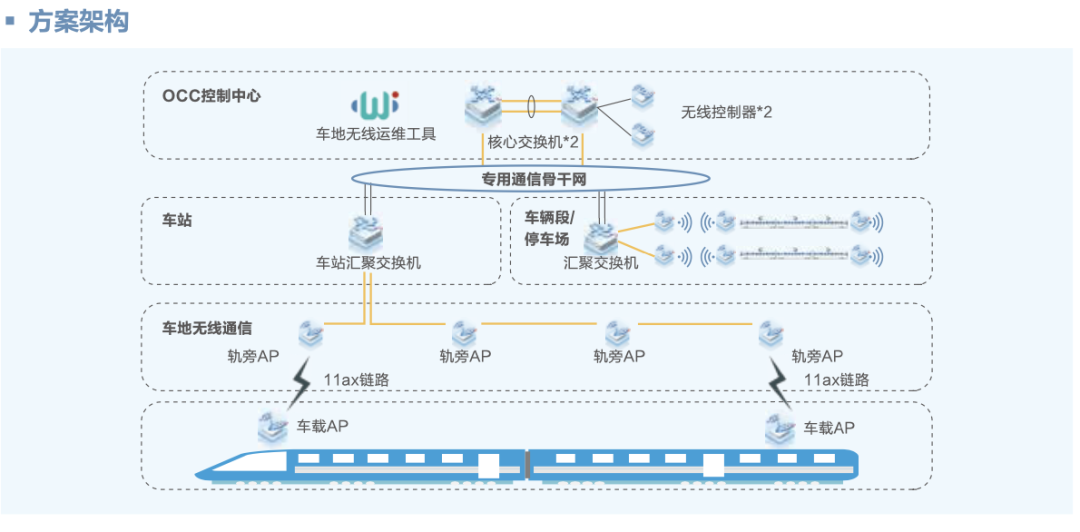 隨著PIS視頻及CCTV視頻的高清化趨勢,車地?zé)o線轉(zhuǎn)儲新應(yīng)用要求提供更高的車地帶寬。同時在應(yīng)用中,還發(fā)現(xiàn)車地?zé)o線安裝部署慢,車地?zé)o線出問題故障定位難,運維效率低等問題。銳捷為解決以上需求全新推出城軌高速車地?zé)o線解決方案,具有高帶寬、新業(yè)務(wù)承載無憂;穩(wěn)切換、視頻流暢不中斷;快安裝、線路施工進度快;可視化、設(shè)備運維成本低的價值。