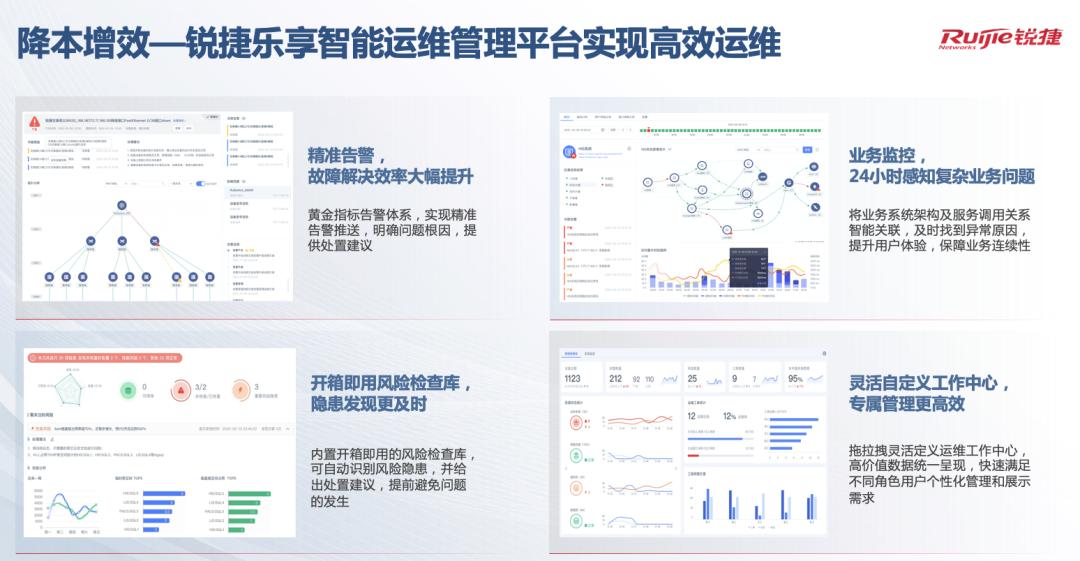 銳捷樂享智能運維管理平臺,為城軌行業(yè)全域IT資源構(gòu)建自動化、多層級、精準(zhǔn)化關(guān)系網(wǎng),結(jié)合專業(yè)的知識分析能力,實現(xiàn)對故障和隱患由外而內(nèi)、由內(nèi)而外的觀測,最終達到運維管理上的“先見先行”。該平臺可通過“為執(zhí)行賦能”、“為管理賦知”、“為決策賦見”,致力于讓IT運維管理變得更加輕松。