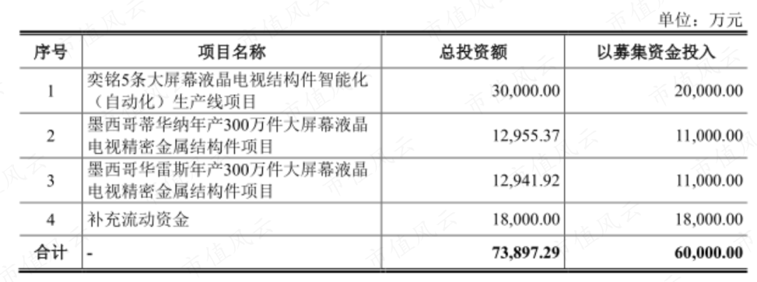 2022年1月11日完成定增募集,以17.31元/股的價格,非公開發(fā)行3000萬股,募集5.19億元,主要用于奕銘5條大屏幕液晶電視結(jié)構(gòu)件智能化(自動化)生產(chǎn)線項目以及墨西哥兩大生產(chǎn)基地建設(shè)等。