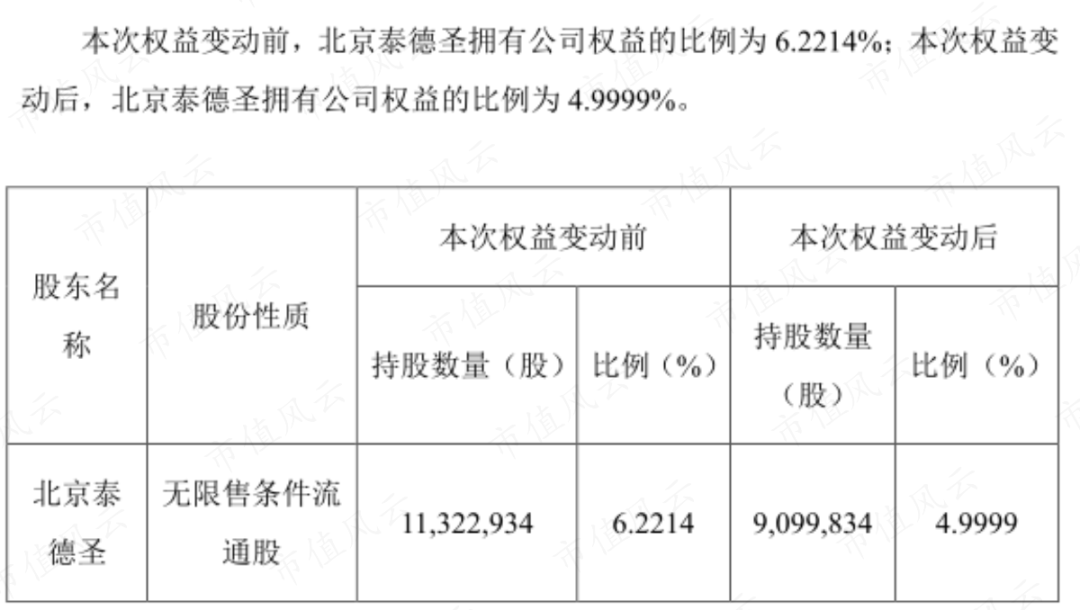 泰德圣持股數(shù)降至909.98萬股,持股比例降至4.9999%。這個巧妙的、意味深長的比例代表著什么,大家都懂的——意味著接下來的減持不需要再知會上市公司了。